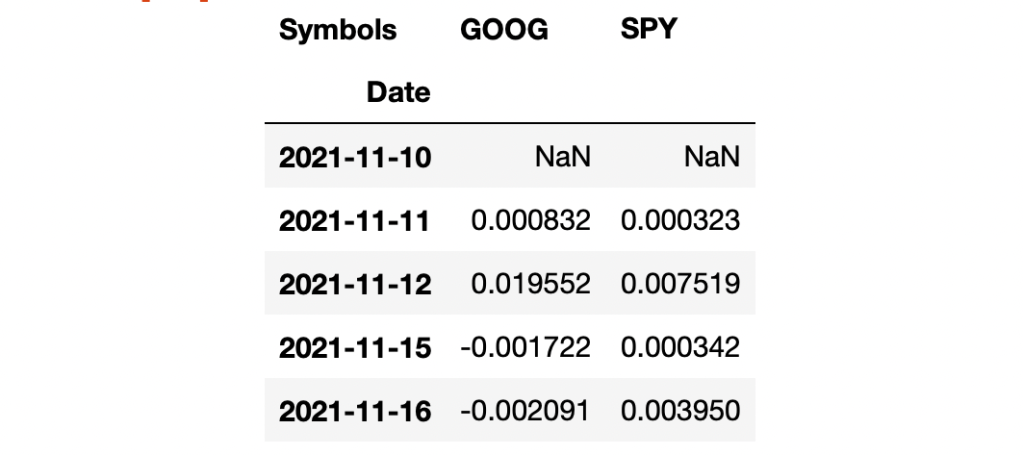 We’re not going to be using the closing prices directly, so I’m going to calculate the instantaneous rate of returns for both Google and the S&P 500 etf.