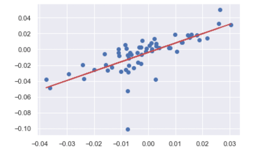 With all that, we are now ready to sort of start looking at a regression. I think the first thing that makes sense to do is probably get a correlation here. So I will take our returns and I’m going to apply the pandas method (.corr) and we can see they’re pretty strongly correlated.